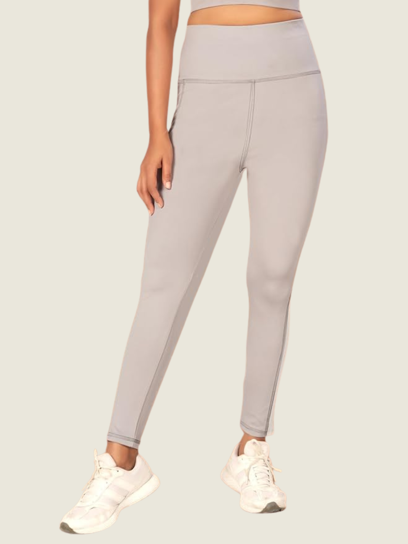 These High-Rise Side Panel Yoga Tights in Soft Pearl Grey offer a minimal, elegant look while delivering maximum comfort and flexibility. Perfect for women who love subtle tones with premium performance.